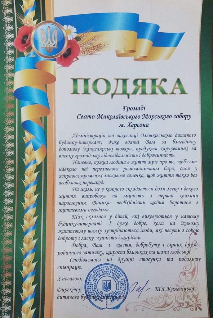От лица персонала и воспитанников детского дома, директор Княгицкая Т.Г. выразила искреннюю благодарность духовенству и общине Морского собора за неоднократную помощь и заботу о детях-инвалидах.